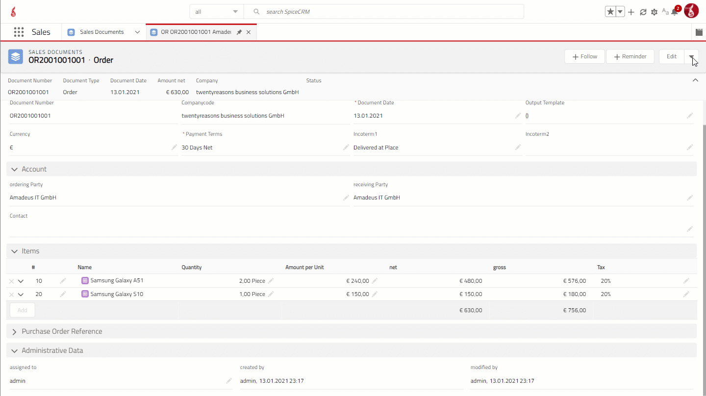 Convert an order into an invoice effortlessly with SpiceCRM’s one-click functionality.