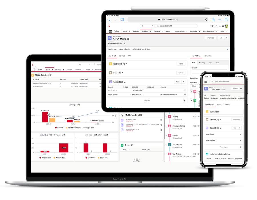 It’s fantastic to find records by typing just a few words in a search field. Users will feel like they’re using Google when searching in the CRM. SpiceCRM relies on the powerful ElasticSearch engine for fast, efficient results: contact names, addresses, emails, phone numbers, duplicates, calendar entries. Searches span the entire CRM, delivering immediate results. These results can then be aggregated and filtered for readability.