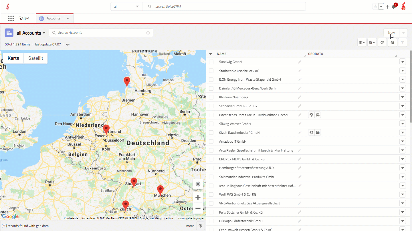 Integrated Google Search and Google Maps help users create new accounts or leads. By typing the company name, the autocomplete feature suggests matches based on Google Search. Once selected, it fills in the address, website, phone number, and name. Proximity search and Google Maps make finding nearby customers effortless. Additional features and plugins allow easy map visualization and support efficient routing for planned visits.